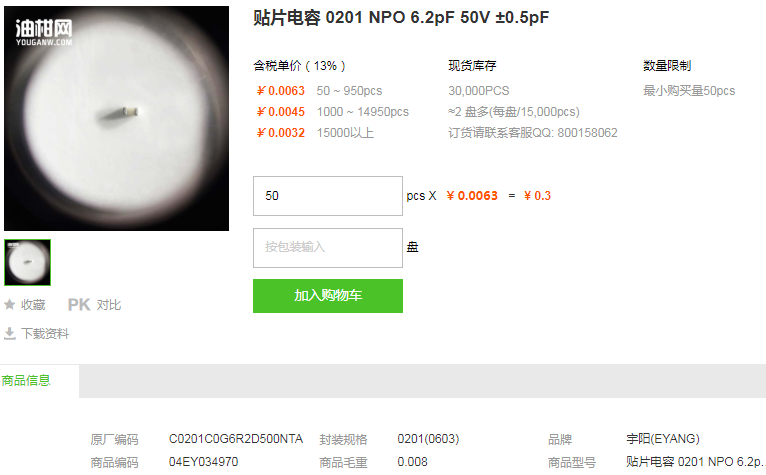 宇阳(EYANG)原厂一级代理,销售所有宇阳贴片电容_贴片电容0201NPO6.2pF50V型号,全部来自原厂,50PCS起订,宇阳贴片电容_贴片电容0201NPO6.2pF50V型号价格0.0032。